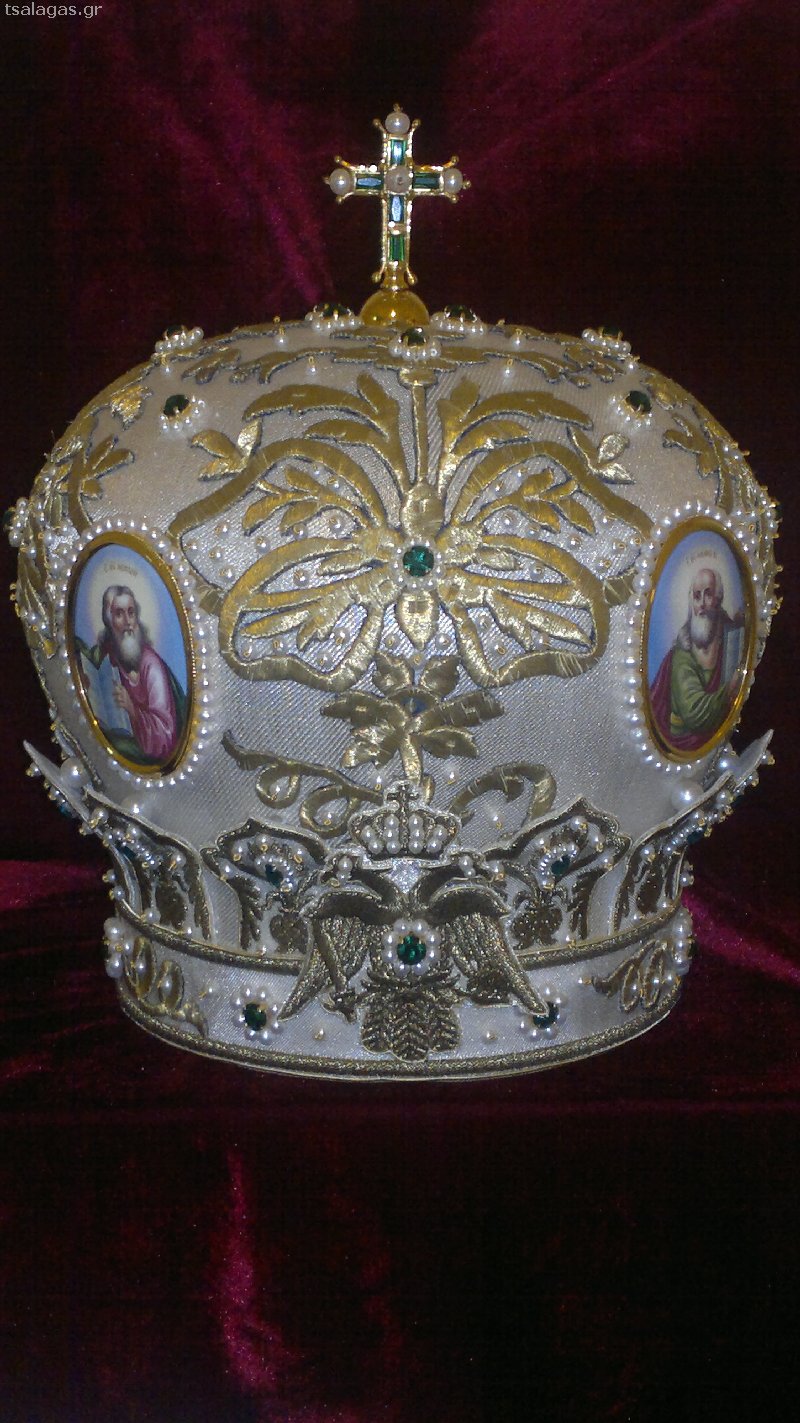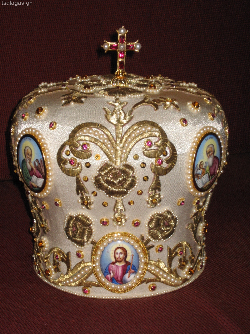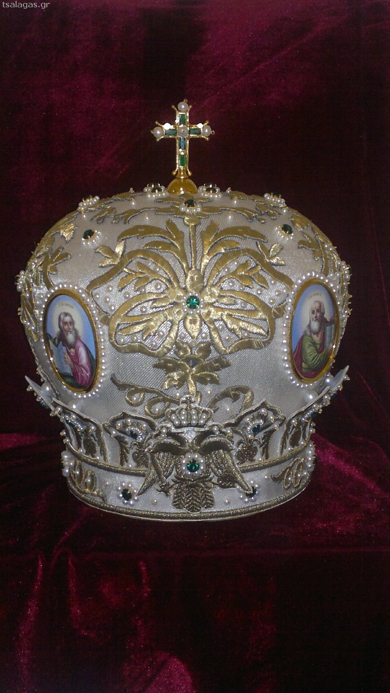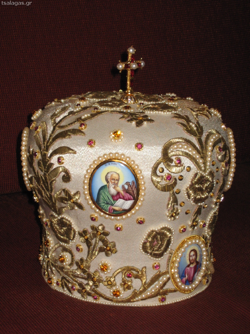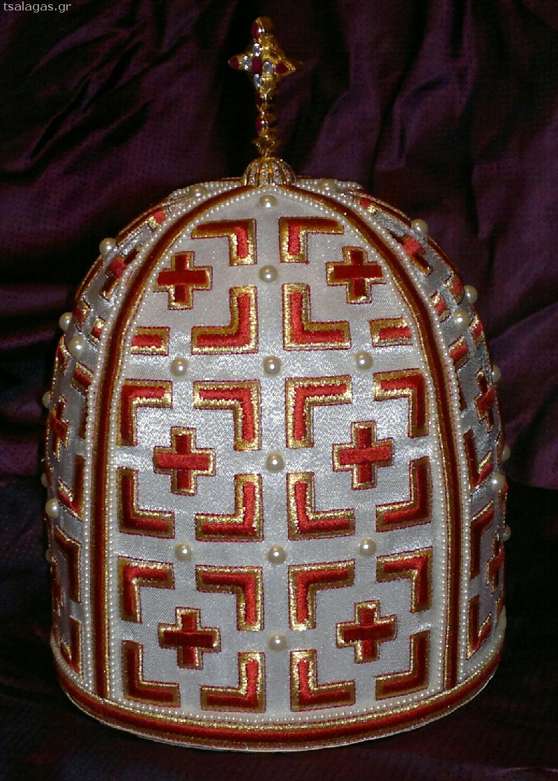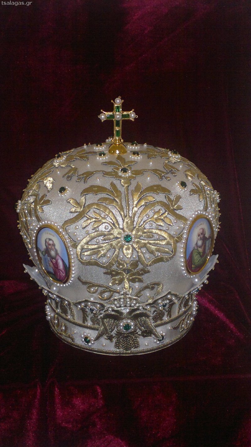 Αρχιερατικές μίτρες κατασκευασμένες από χειροποίητο χρυσοκέντητο καφτάνι. Τα σχέδια έχουν καθαριστεί, κοπεί και μεταφερθεί στο καλούπι της μίτρας με το χέρι. Κατόπιν παραγγελίας μπορούμε να μεταφέρουμε και να προσαρμόσουμε κεντήματα που μας αποστέλλετε.