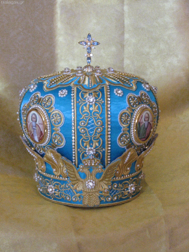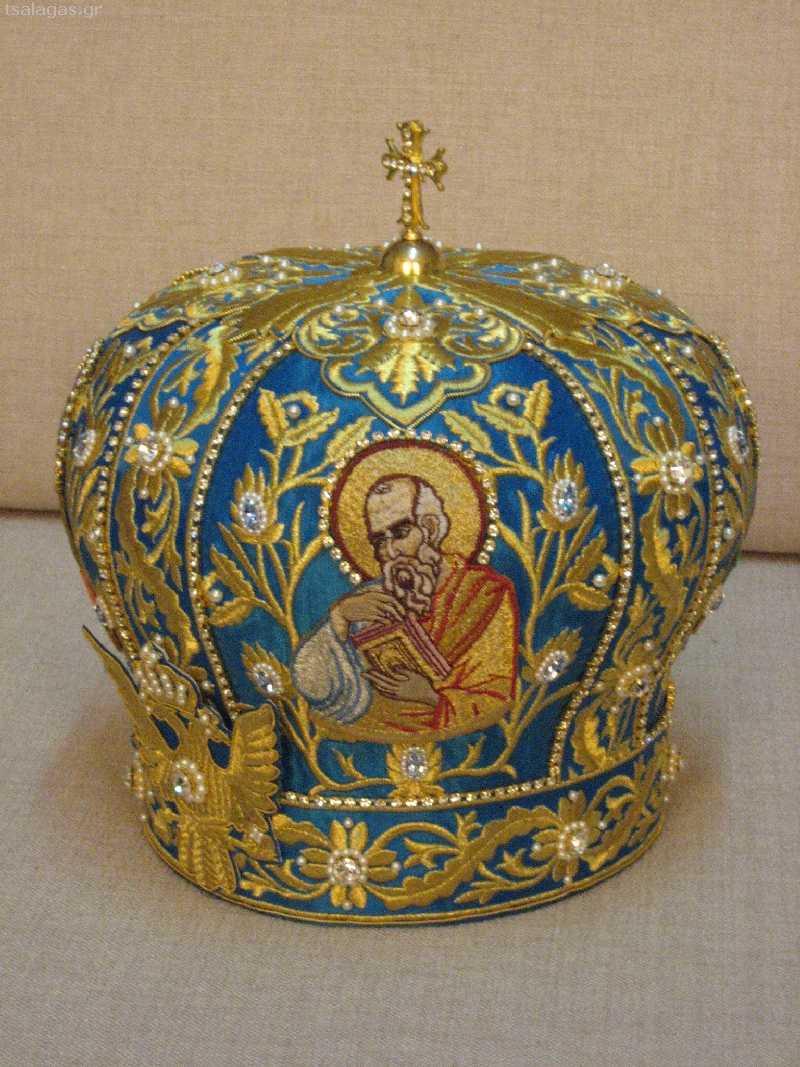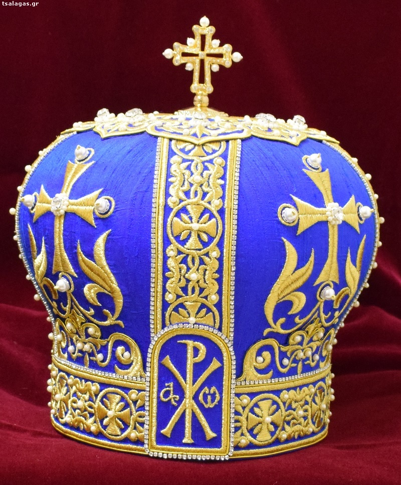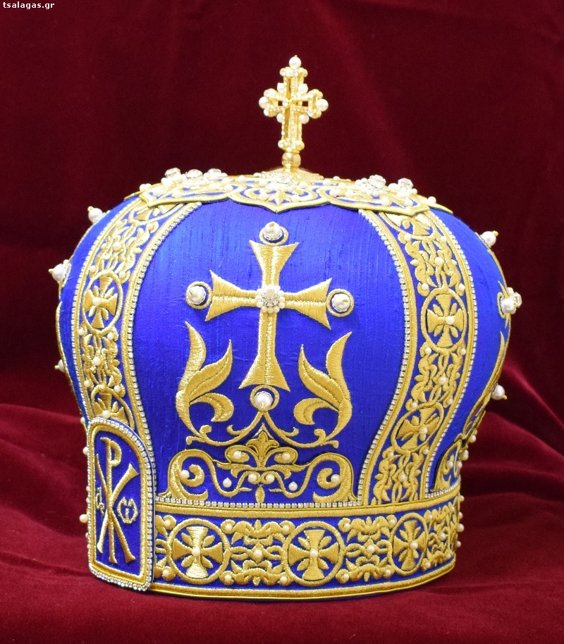 Αρχιερατικές μίτρες, κατασκευασμένες από ύφασμα Μεταξωτό «Μπλε» κεντημένες με κλωστή χρυσή χρώματος λίρας, ανοιχτό χρυσό και ασημί. Διακοσμημένες με ημιπολύτιμους λίθους και μαργαριτάρια καθώς και σμάλτα ρωσικής τεχνοτροπίας. Υπάρχει δυνατότητα επιλογής χρωματισμού κατόπιν παραγγελίας.